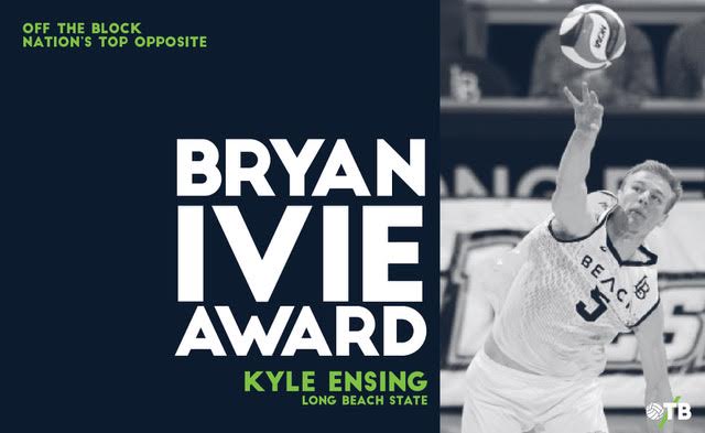 The Bryan Ivie Award is one of several end of season awards presented by Off the Block. Among the other national awards includes Lloy Ball Award to the nation’s top setter, the Karch Kiraly Award to the nation’s top outside attacker, the Erik Shoji Award to the nation’s top libero and the Ryan Millar Award to the nation’s top middle attacker.