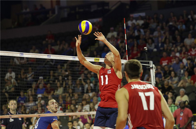NCAA players on U.S. roster: TJ DeFalco (Long Beach State); Kyle Ensing (Long Beach State); Matt Anderson (Penn State 2006-08); Micah Christenson (USC 2012-15); Max Holt (Penn State 2006-09); Thomas Jaeschke (Loyola 2013-15); Jeff Jendryk (Loyola 2015-18); Jake Langlois (BYU 2014-17); Dan McDonnell (UC Irvine 2011-12); Aaron Russell (Penn State 2012-15); Kawika Shoji (Stanford 2007-10); Erik Shoji (Stanford 2009-12); David Smith (UC Irvine 2004-07); Dustin Watten (Long Beach State 2005-09)