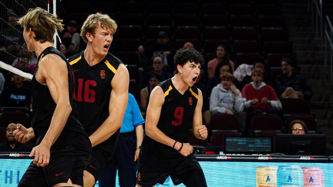 Caleb Blanchette with No. 12 USC leading by one point late in the fourth game delivered an ace to extend the lead and put the Trojans at match-point as the team defeated No. 9/6 Penn State 25-22, 25-19, 15-25, 25-23 on Wednesday in Los Angeles.