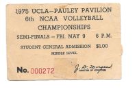 The field for the 1975 NCAA Tournament had a different look compared to previous years. Both Ohio State and Yale were making their first appearances in the NCAA Tournament, while the perennial West Coast powerhouses of early-1970s UCLA and UC Santa Barbara rounded-out the four-team field. Ohio State in its semifinal match lost the eventual NCAA champions UCLA in four games. In addition, Yale in its program’s only NCAA Tournament appearance lost to UC Santa Barbara in three games. This ticket stub from those semifinal matches celebrates the success of all four programs and the historical contributions they have provided college men’s volleyball. To order this ticket stub, click here.