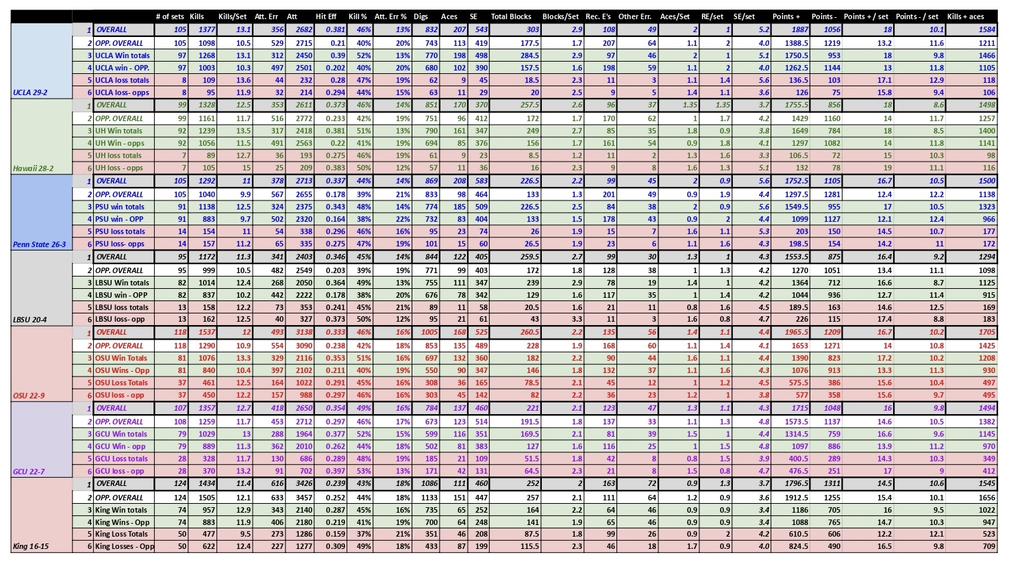 – Everyone’s favorite statline: UCLA’s and Penn State’s wins combine for over 1,000 SE’s. UCLA is at 5.1 SE/set and PSU is at 5.6 SE/set.