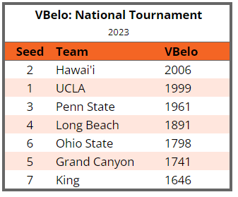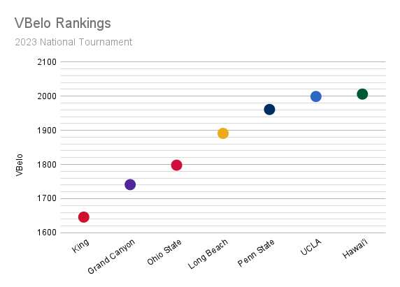 Even at the “bottom” of the bracket, all of the teams are above average. The average of the seven teams in the tournament is a whopping 1863! A rating of 1863 is just behind Long Beach for the fifth highest VBelo rating of any team in the country.