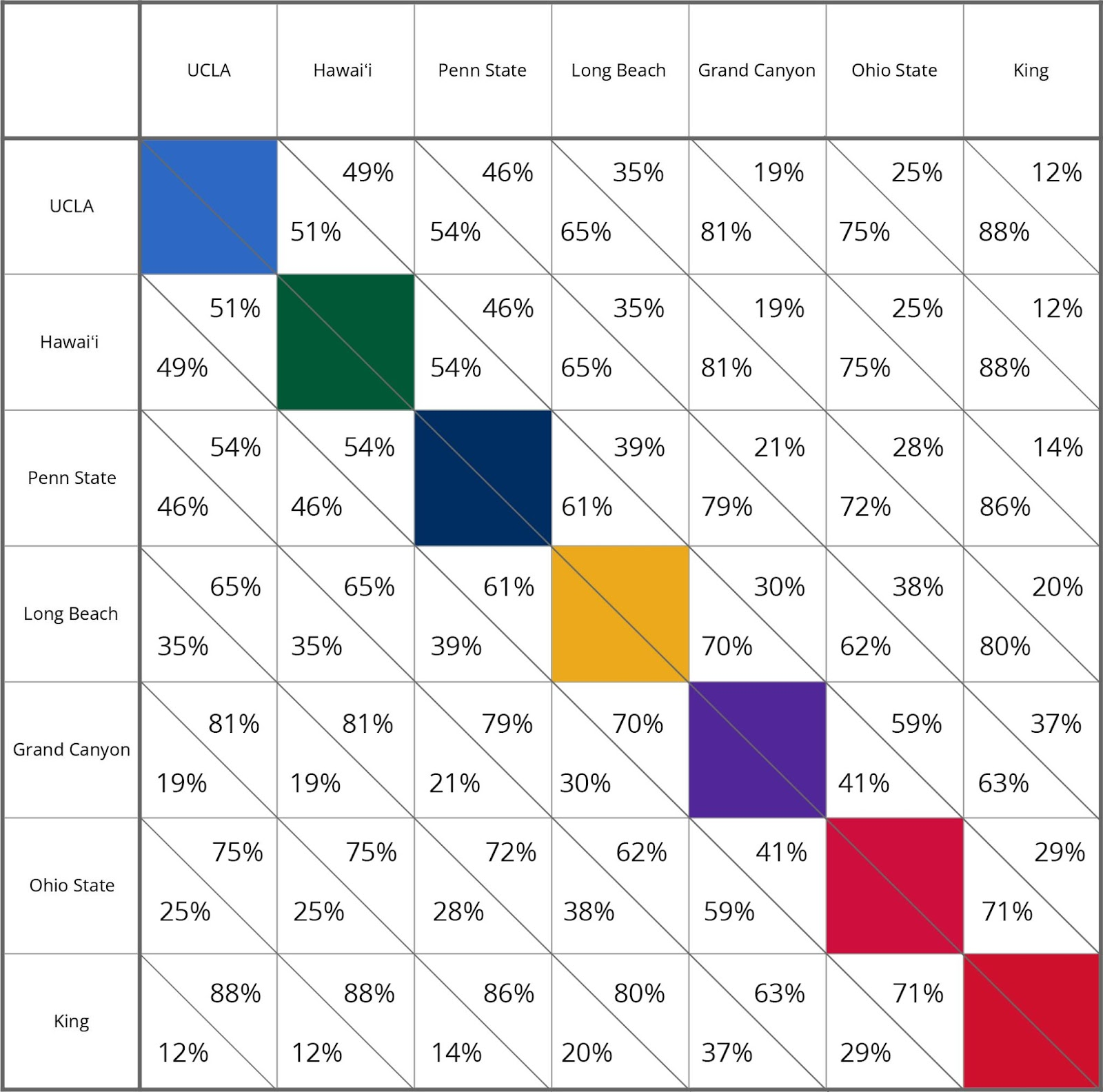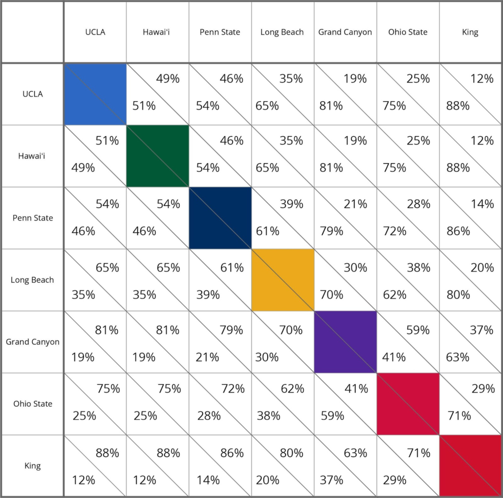 At the top, Hawaiʻi and UCLA are in a virtual tie, separated by only seven points. On a neutral court, this equates to a less than 0.5% advantage. To say that these teams are evenly matched, in terms of strength is an understatement. They are elite level teams.